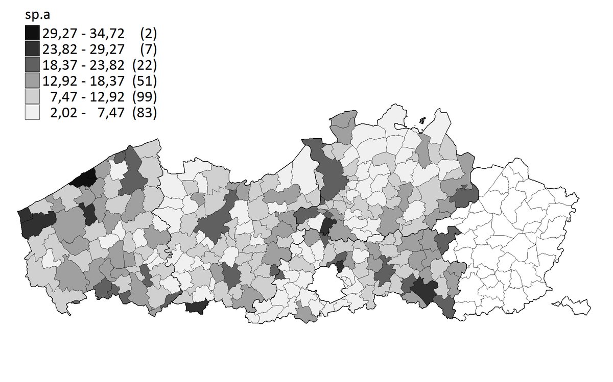 Een gescheiden resultaat in de vier provincies waar Groen en sp.a apart naar de kiezer zijn gegaan, kan meer duidelijkheid brengen of de geografische spreiding van hun achterban samenvalt. Uit Kaart 5 blijkt Groen vooral in en rond Gent, Leuven en Antwerpen (allemaal universiteitssteden) sterk te staan. Het stedelijke profiel komt nog scherper tot uiting bij sp.a (Kaart 6), die het relatief goed doet in Gent, Leuven of Antwerpen maar veel minder in de omringende gemeenten.