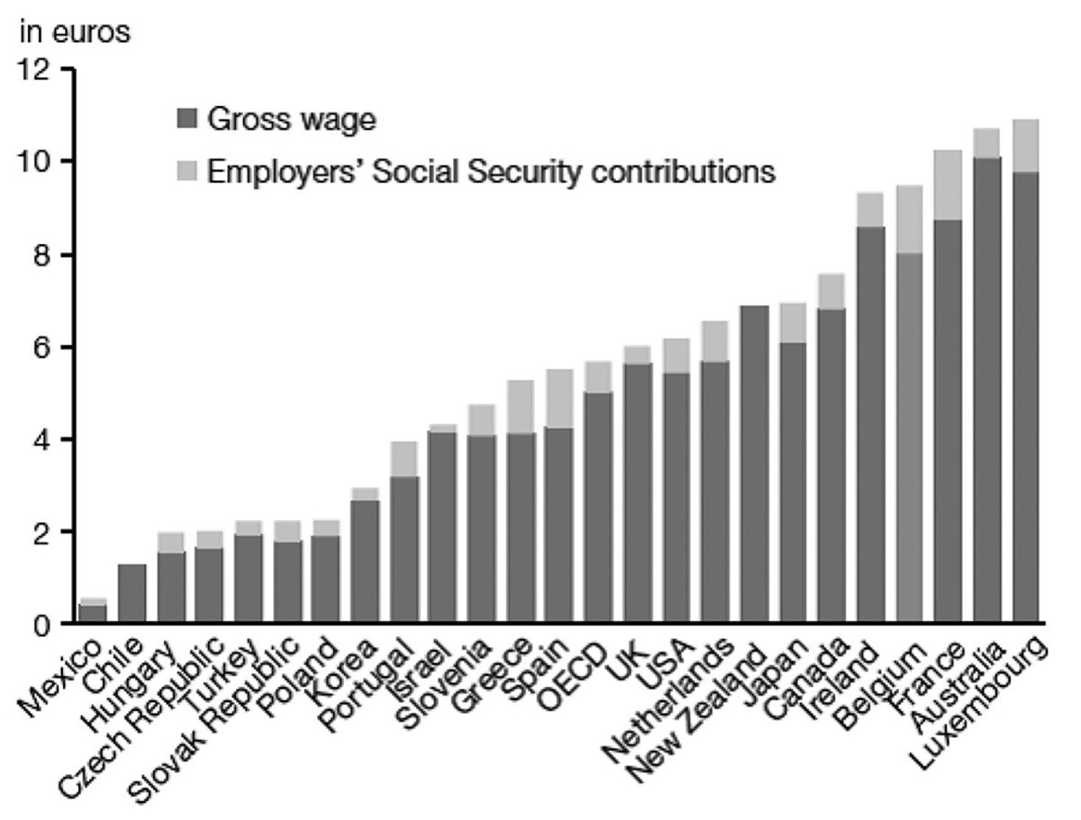 Figuur 2: Uurloonkost van een twintigjarige werknemer tewerkgesteld aan het minimumloon in OESO-landen waarin er een minimumloon van kracht is, 2010.