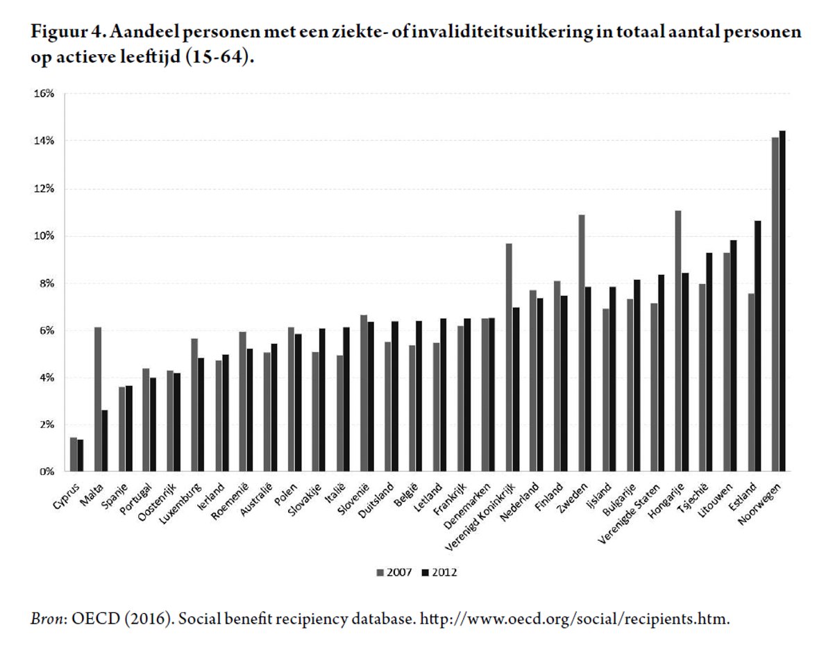 Figuur 4 toont het aandeel van de mensen die een beroep doen op een ziekte- of invaliditeitsuitkering in de totale populatie op actieve leeftijd, opnieuw voor het jaar 2007 en het jaar 2012. In België deed 6% van de bevolking op actieve leeftijd een beroep op ziekte- en invaliditeitsuitkeringen, gelijkaardig aan landen als Duitsland, Frankrijk en Denemarken. In Scandinavische landen Finland, Zweden en IJsland doen ongeveer 8% van de actieven beroep op dit stelsel; in Noorwegen loopt dit zelfs op tot 14%. In het Verenigd Koninkrijk, Zweden, Malta en Hongarije is het aantal ziekte- en invaliditeitsuitkeringen sinds de crisis fors gedaald. In het algemeen geldt ook hier dat landen met een hoog aantal personen met een werkloosheidsuitkeringen over het algemeen minder mensen kennen die beroep doen op ziekte- of invaliditeitsuitkeringen (r = -0.22).