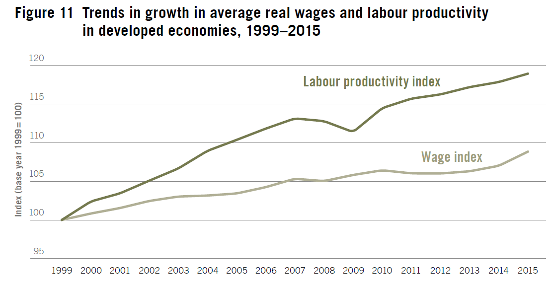 In haar meest recente Global Wage Report2 kwam de Internationale Arbeidsorganisatie al tot eenzelfde conclusie. Uit hun onderzoek naar 36 landen bleek dat sinds 1999 de lonen meer dan 10% achterop lopen ten opzichte van de productiviteitsontwikkelingen.