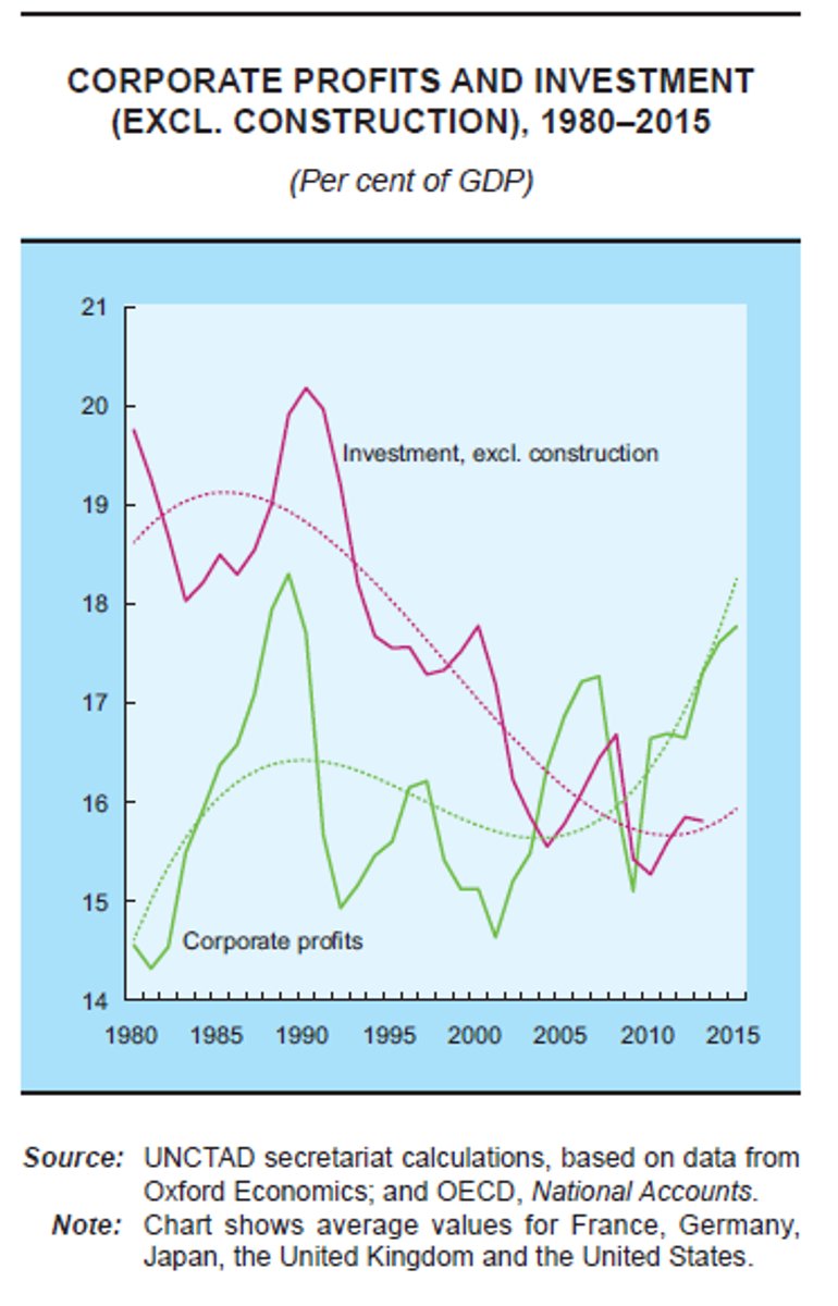 Maar is een dalend loonaandeel per se negatief? Minder lonen betekent misschien minder kosten voor ondernemingen en dus meer investeringen, meer competitiviteit, meer export, meer jobs en meer welvaart voor iedereen? Dat blijkt jammer genoeg niet zo te zijn. De verschuiving van arbeidsinkomen naar kapitaalsinkomen heeft niet de verwachte resultaten opgebracht qua investeringen. Cijfers van de UNCTAD5 tonen aan dat vanaf de jaren 2000 de bedrijfswinsten (het kapitaalsaandeel) sterk stijgen, maar dat de investeringen die evolutie niet volgen.