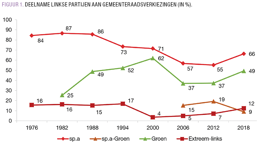 Figuur 1 geeft de evolutie weer van de deelname van socialistische, groene en extreemlinkse lijsten aan de gemeenteraadsverkiezingen tussen 1976 (de eerste gemeenteraadsverkiezingen anticiperend op de samenvoeging van gemeenten in 1977) en 2018. Onder extreemlinkse kiezers bedoelen we die stemmen die tussen 1976 en 2018 uitgebracht zijn op KPB, RAL-SAP, AMADA-PVDA en een aantal linkse eenheidslijsten.