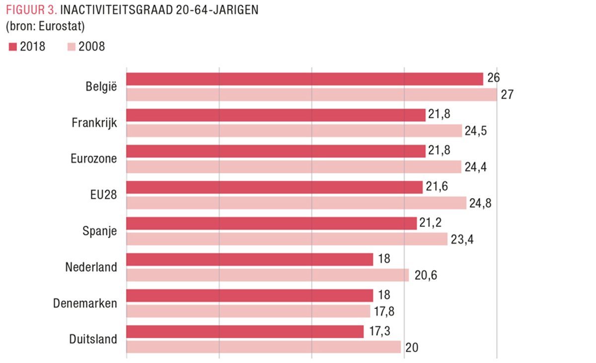 Laten we niet vergeten dat, ondanks onze recente puike arbeidsprestaties, de inactiviteitsgraad bij de bevolking op arbeidsleeftijd (20-64 jaar) nog steeds heel hoog ligt. FIGUUR 3 geeft aan dat deze inactiviteitsgraad in ons land niet alleen beduidend hoger ligt dan in de rest van Europa, maar dat ook de daling ten opzichte van 2008 minder omvangrijk is geweest dan we op het eerste zicht zouden denken.