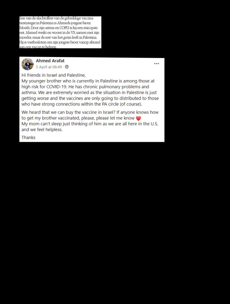 Eén van de slachtoffers van de gebrekkige vaccinatiestrategie is Ahmeds jongere broer Moath Arafat. Door zijn astma en COPD is hij een risicopatiënt. Ahmed werkt en woont in de Verenigde Staten, samen met zijn moeder, maar de rest van het gezin leeft in Palestina. Ahmed: 'Mijn broer is taxibestuurder. Hij heeft veel risicocontacten. Mijn moeder en ik zeggen dat hij thuis moet blijven, maar mijn vader en ooms verplichten hem om te werken. Ze rekenen op zijn inkomsten. In Palestina bestaat er geen vangnet voor tijdelijk werklozen.' Ahmed gaat verder: 'De samenleving gaat heel slecht om met de pandemie. Corona wordt gezien als aeeb, iets om je voor te schamen, net als kanker. Veel mensen in mijn dorp geloven in de samenzweringstheorieën over het virus die de ronde doen. Daarnaast is het ook heel moeilijk om een vaccin te verkrijgen zonder connecties binnen de cirkel van de Palestijnse autoriteit.'