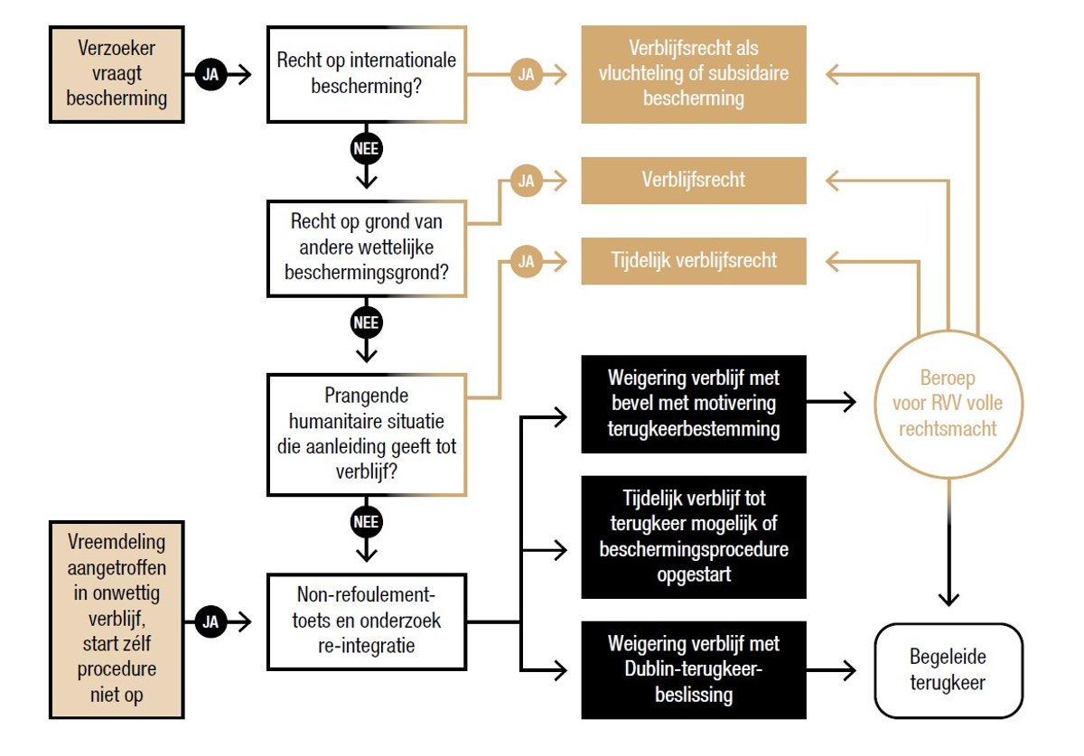 Aan het einde van de procedure wordt ofwel een verblijfsrecht toegekend, dat kan verschillen naargelang de rechtsgrond, ofwel wordt een beslissing afgeleverd in het kader van een begeleid terugkeertraject. Duidelijk en gemotiveerd.