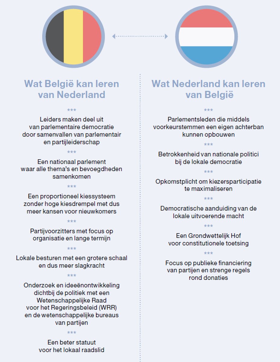 De pijnpunten zijn soms gelijkaardig aan die van ons land. Soms zijn ze net verschillend. Inzake democratische structuren zouden we eerder moeten proberen het beste van de twee landen op te tellen. Het uitgangspunt van die analyse is eigenlijk gelijkaardig voor België en Nederland. Het is een focus op structuren, eerder dan op cultuur, mentaliteit of talent. Het probleem is niet wie onze politici zijn, maar hoe wel hoe ze moeten werken en in welke context.