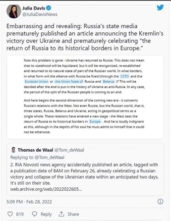 Deze analyse wordt verder ondersteund door een aantal opmerkelijke elementen. Een per ongeluk uitgelekt en voorbereid perscommuniqué van het Russian Information Agency (RIA), dat even online werd geplaatst op 28 februari 2022, kan deze visie bevestigen (AFBEELDING 1). Een eerdere tweet van de Russische buitenlandcommentator Dmitri Trenin ging in dezelfde lijn (AFBEELDING 2). Tegelijk stelde de Russische buitenlandminister Lavrov, op zijn persconferentie tijdens een Turkse bemiddelingspoging in Antalya op 10 maart 2022, dat 'Rusland vecht voor haar plaats in het wereldsysteem'.