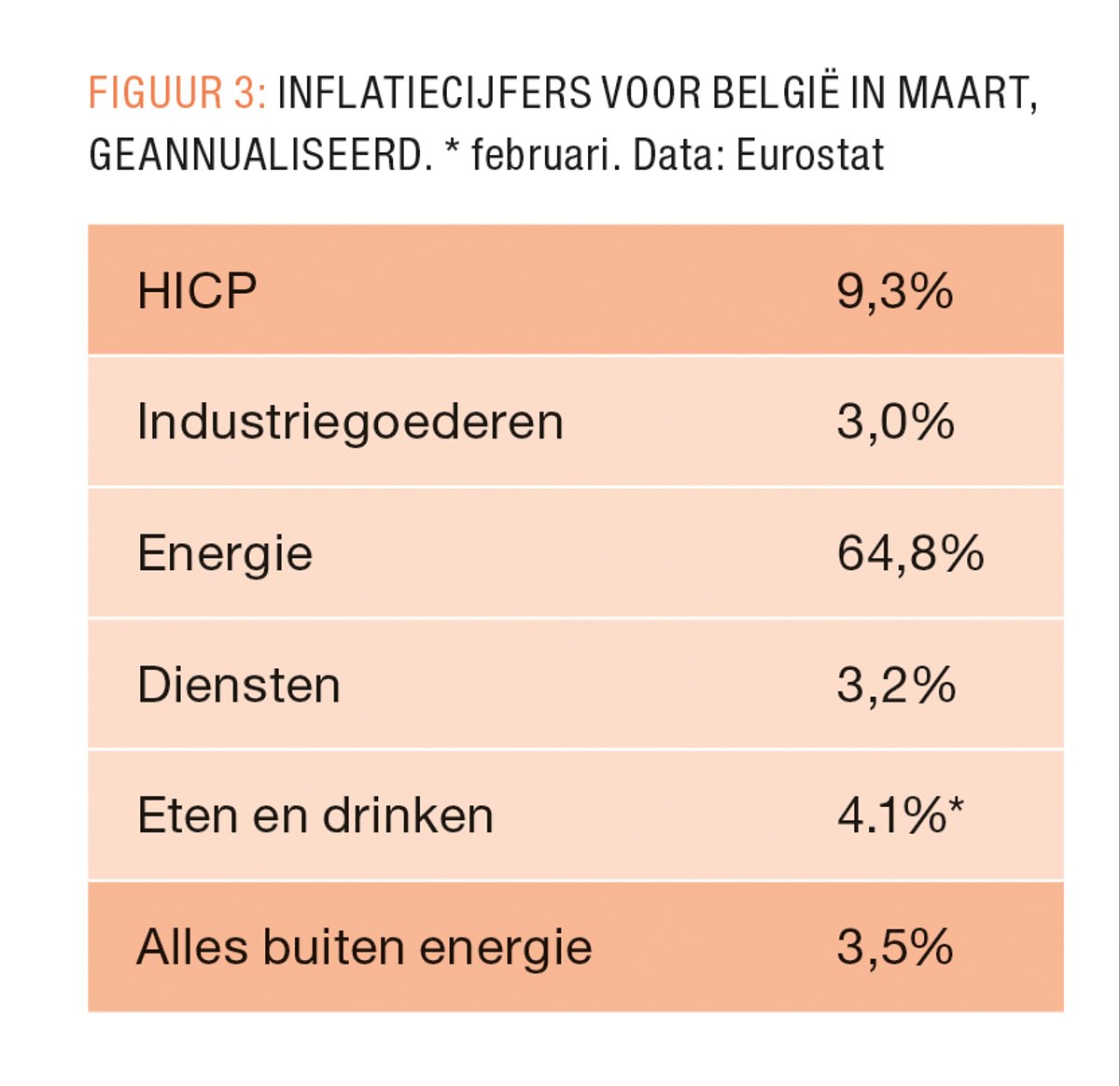 En dat is precies wat er nu aan de hand is. De index stijgt met meer dan 9%. Historisch, wordt er gezegd. Catastrofaal, wordt er gezegd. Maar wanneer we kijken naar wat er schuilt achter die index krijgen we een ander en genuanceerder beeld van wat er gaande is. De grootste drijver van de hoge inflatie blijft veruit de component energie (FIGUUR 3). Daar stijgen de prijzen met 65%, wat de algemene index natuurlijk de hoogte induwt. Wanneer we een index bekijken zonder deze component energie blijft de prijsstijging beperkt tot 3,5%. Dat lijkt redelijk veel, maar is geen reden tot paniek. De prijs van diensten stijgt met 3,2%, terwijl die van voeding en industriegoederen stijgt met 3%, wat vooral te wijten is aan de oorlog enerzijds en de blijvende problemen in aanvoerketens als gevolg van de pandemie anderzijds. Sommigen prijzen stijgen zelfs helemaal niet, zoals Telecommunicatie, Educatie en Gezondheid, en sommige dalen zelfs, zoals die van het Openbaar vervoer. Inflatie is niet universeel, maar contextueel. Ook ons antwoord op inflatie moet dus specifiek zijn.