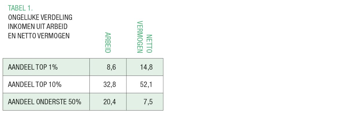 Alle empirische onderzoeken over dit thema tonen aan dat vermogen veel ongelijker verdeeld is dan inkomen uit arbeid. De World Inequality Database rapporteert voor België (in 2018, het recentste beschikbare jaar) de volgende cijfers in TABEL 1.6