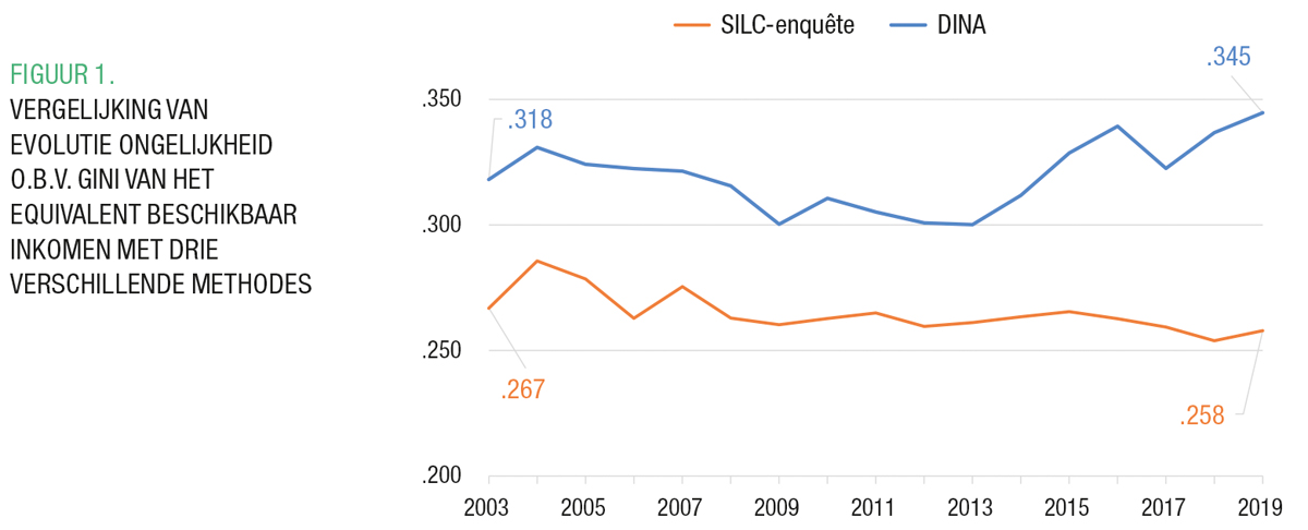 Ten tweede is bovenstaande verdeling nog steeds exclusief gebaseerd op survey-informatie. In buitenlandse toepassingen van de DINA-methodologie worden ook bijkomende administratieve bronnen, zoals databanken van de sociale zekerheid (in België de Kruispunt Bank Sociale zekerheid) of fiscale aangiften ingezet om het beeld te verfijnen. De combinatie van de verschillende bronnen is niet altijd vanzelfsprekend. Maar zeker voor de uiteinden van de inkomensverdeling – zowel bovenaan, als onderaan – is het belangrijk de mogelijke niet representativiteit of onvolledigheid van de survey-informatie kritisch onder de loep te nemen, en waar mogelijk bij te sturen. De methodologie om de verdelingen te corrigeren of aan te vullen is er en het conceptuele DINA-kader staat op punt. Als ook de in haar opiniestuk uitgesproken nieuwjaarswens van Sarah Kuypers over vlottere toegankelijkheid van deze data voor onderzoek bewaarheid zou worden, dan kunnen we de paradox van de ongelijkheidsevolutie in België wellicht verder ontrafelen.