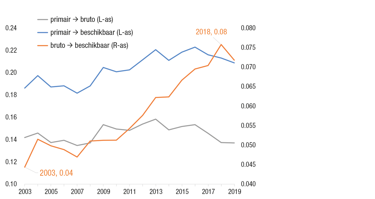 Meestal wordt de mate van herverdeling gerapporteerd door de ongelijkheid in het beschikbaar inkomen te vergelijken met de ongelijkheid in het bruto-inkomen vóór belasting (bijvoorbeeld Causa et al. 2018 of Verbist and Figari, 2014). Dat is de oranje curve in het rechterpaneel (onderste beeld). Omdat de omvang van dit verschil kleiner is dan bij de vorige twee curves, geven we dit verschil afzonderlijk weer op de rechteras. In 2018 bijvoorbeeld bedroeg de Gini van het bruto-inkomen 0,484, en die werd door belastingen en uitkeringen teruggebracht tot een Gini van 0,404 voor beschikbaar inkomen. Het verschil van 0,08 is de maatstaf van herverdeling. De continue stijgende lijn van deze maatstaf van herverdeling is een opmerkelijk resultaat: ze drukt uit dat de ongelijkheid in het bruto-inkomen meer is toegenomen dan de ongelijkheid in het beschikbaar inkomen. Een andere manier om dit te 'lezen' is dat, gegeven de toename in ongelijkheid in het bruto-inkomen, de herverdelende processen in de welvaartsstaat steeds harder moeten draaien om – zeker vanaf ongeveer 2011 – de ongelijkheid in het beschikbaar niet (nog) meer te laten toenemen.6