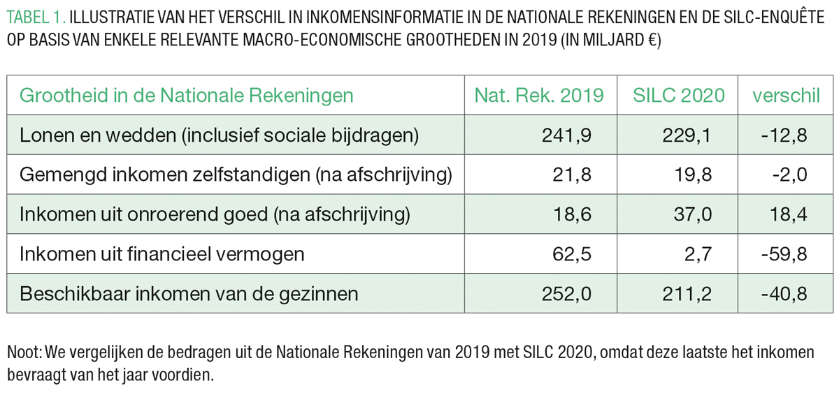 Ten eerste missen we in die enquêtes een deel van het inkomen dat in een economie beschikbaar is. We illustreren dat in TABEL 1 aan de hand van enkele inkomenstotalen voor 2019. We vergelijken het macro-aggregaat voor 2019 in miljard €, met het totaal dat we observeren in de EU-SILC bevraging van 2020 over de inkomens van 2019.