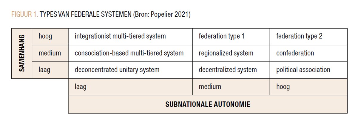 Toegepast op België, blijkt dat ons systeem veel autonomie geeft aan de (grootste) gemeenschappen, maar slechts matige samenhang inbouwt. Een confederatie dus.