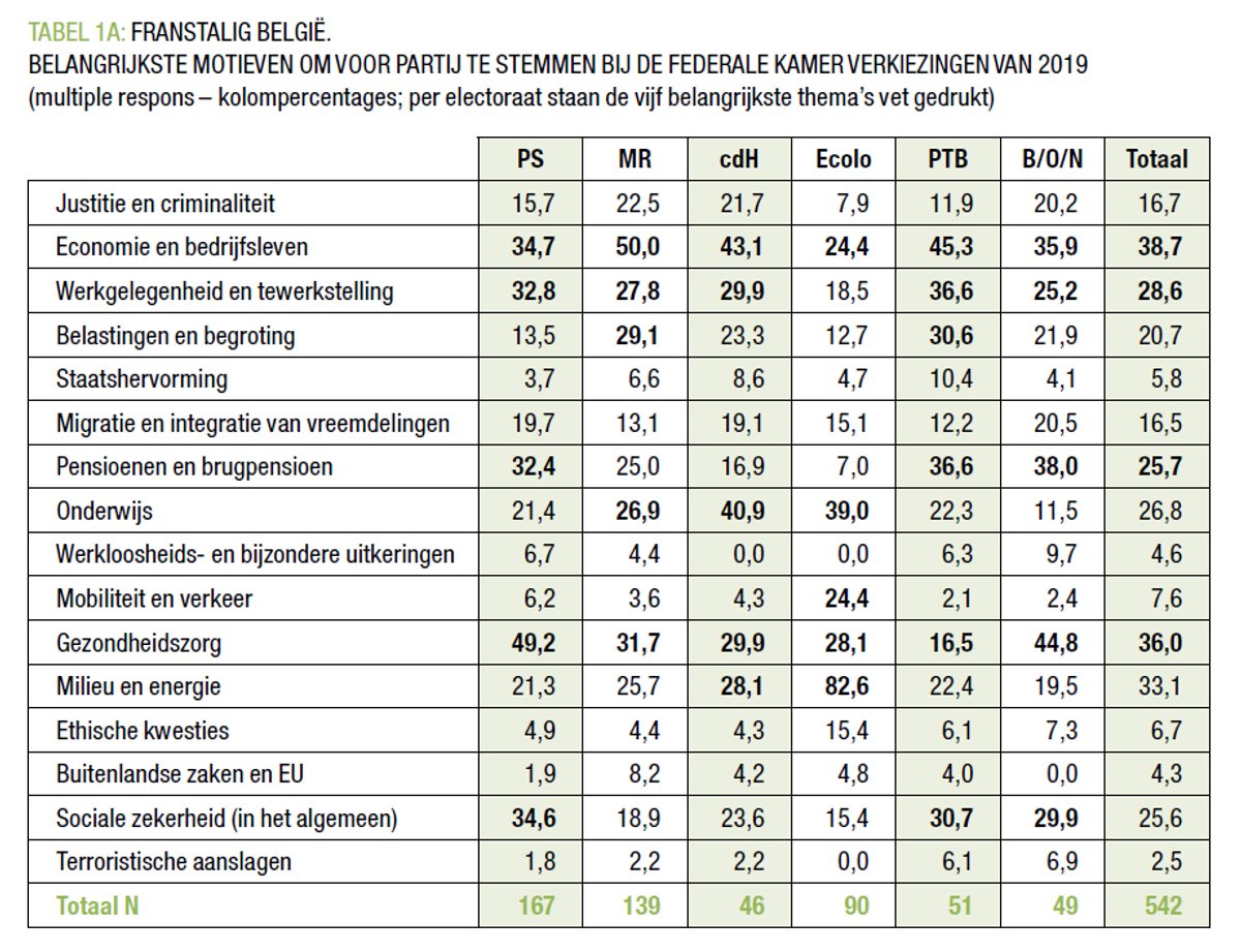 Eerst en vooral zien we in Franstalig België dat migratie en integratie van vreemdelingen slechts een marginale rol speelt. Sociaaleconomische thema’s – zoals economie en bedrijfsleven, werkgelegenheid en tewerkstelling, pensioenen en brugpensioen, en sociale zekerheid – geven echter de toon aan, temeer vanwege de populariteit bij de PTB-, PS- en MR-electoraten. Gezondheidszorg past ook in dat rijtje maar is geen strijdpunt, omdat het in Covid-tijden voor zowat alle electoraten van bijzonder belang was. Daarnaast heb je nog milieu en energie, waar Ecolo (83%) het grote woord voert. Met andere woorden: in Franstalig België werden de verkiezingen van 2019 bepaald door de inzet op de sociaaleconomische breuklijn, wat in het verlengde ligt van het beeld uit de verkiezingen van 2010 en 2014.