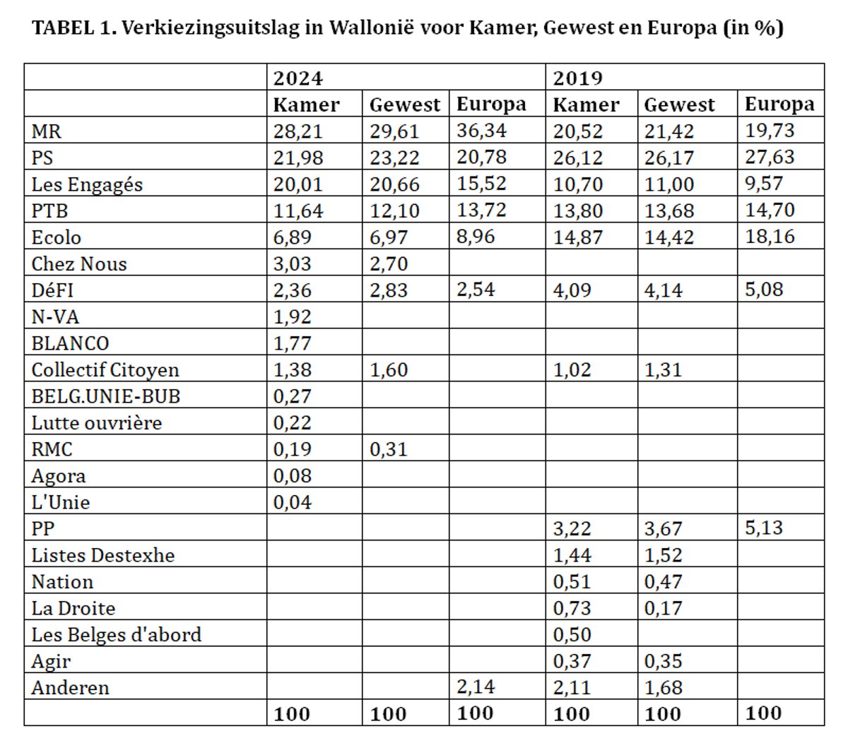 Er ging een schokgolf door Wallonië na de verkiezingsuitslag van 9 juni. Er waren twee duidelijke winnaars. MR haalde 28,2% van de stemmen in de Kamer, 29,6% in het Gewest en 36,3% in Europa (TABEL 1). De Franstalige liberalen staan op één van hun hoogste niveaus ooit ; in 2003 haalden ze al eens 28,5% en in 2007 31,1%. Voor de tweede keer in de geschiedenis in de Kamer en voor het eerst in de Waalse gewestverkiezingen is de liberale familie groter dan de socialistische. De andere grote winnaar was Les Engagés. Het voormalige cdH kwam spectaculair terug van de verkiezingen van 2019 en doorbrak de electorale neergang. Samen halen MR en Les Engagés een meerderheid om Wallonië en de Franse Gemeenschap (Federatie Wallonië-Brussel) te besturen.