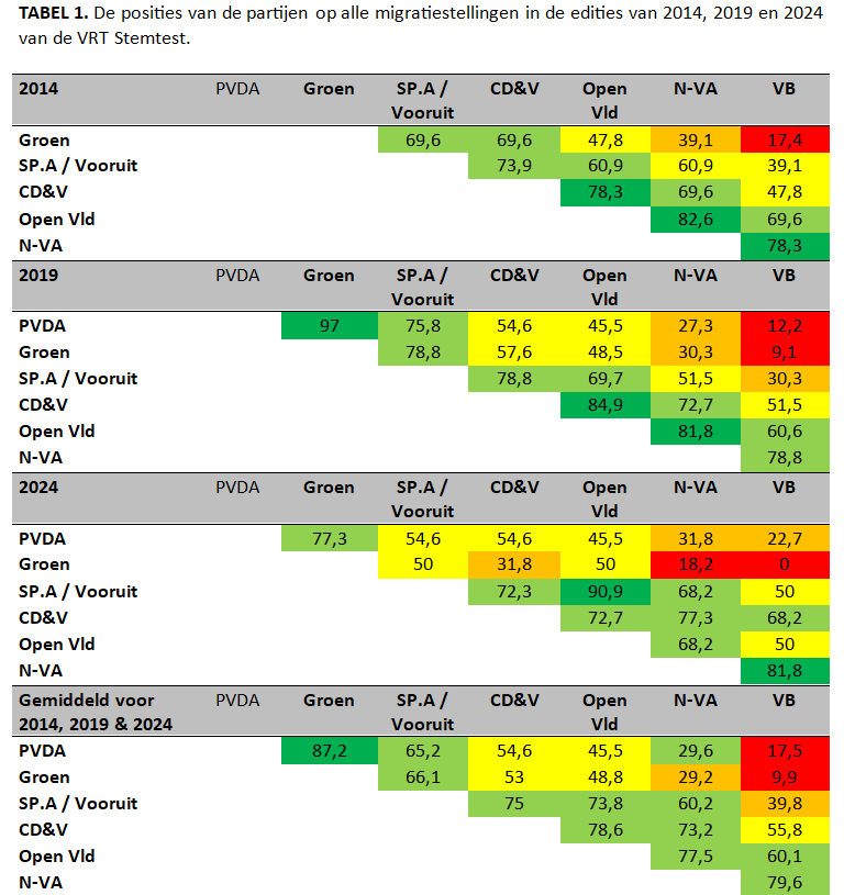 De verschillen tussen linkse en rechtse partijen blijven overeind. De linkse partijen (Groen, PVDA en Vooruit) delen minder standpunten met Vlaams Belang over migratie dan de rechtse partijen. Vooral Groen neemt een afwijkende positie in, en vertoont de minste overlap met de migratiestandpunten van Vlaams Belang. In 2024 beantwoorden ze geen enkele stelling hetzelfde als Vlaams Belang.