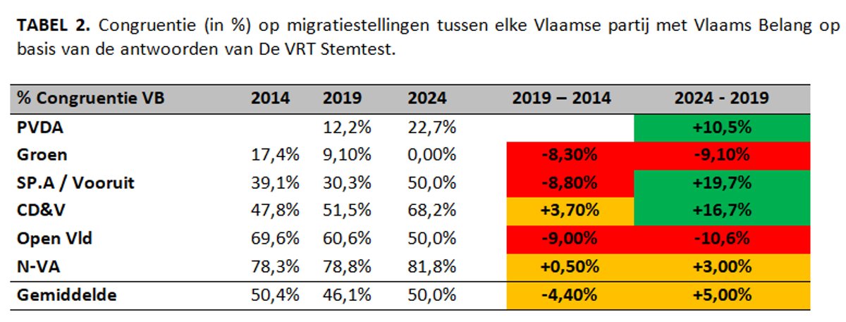 Tussen 2014 en 2019 was er nog een daling in congruentie tussen de migratiestandpunten van de meeste partijen en Vlaams Belang. Tussen 2019 en 2024 tekent zich echter de omgekeerde evolutie af: er sprake van een toename in congruentie met migratiestandpunten voor Vlaams Belang, voor alle partijen (+5.0%). Dit wordt vooral gedreven door Vooruit (+19,7%), CD&V (+16,7%) en PVDA (+10,5%). Ook N-VA komt dichter bij het standpunt van Vlaams Belang, maar de evolutie is minder uitgesproken. N-VA stond ook in 2019 al dicht bij het migratiestandpunt van Vlaams Belang. Twee partijen maakten net de omgekeerde beweging: Open Vld (-10,6%) en Groen (-9,10%). Zij staan in 2024 minder dicht bij Vlaams Belang dan in 2019. Het dominante beeld is echter één van toenemende normalisering van radicaal-rechtse standpunten over migratie, gemeten op basis van de VRT Stemtest.