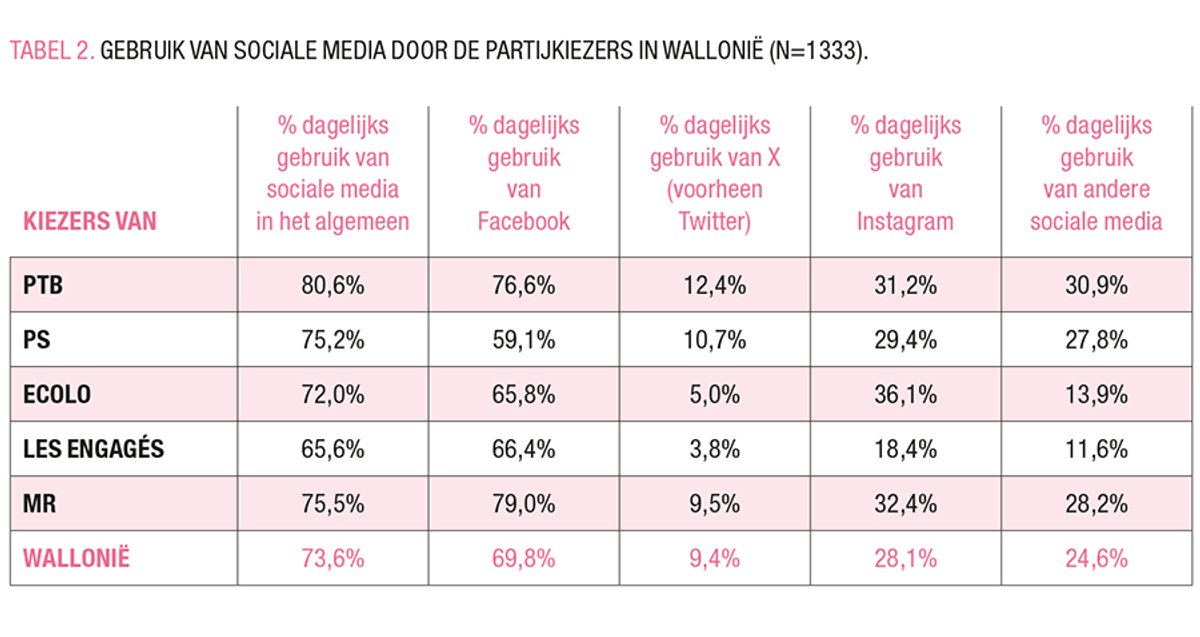 Hoewel de socialemediadiëten bij het electoraat van de Vlaamse partijen twee logica’s lijken te volgen – traditionele versus de radicale (en andere) partijen, en links versus rechts –, zijn deze logica’s niet duidelijk in Wallonië. De twee partijen die eruit springen zijn MR en PTB: hun kiezers zijn aanwezig op alle platformen en informeren zich meer op sociale media dan andere partijkiezers.