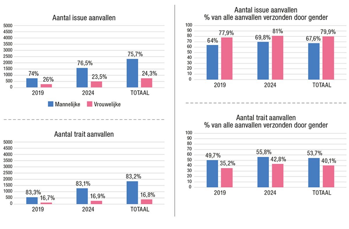Bij trait-based aanvallen is het omgekeerde zichtbaar. Slechts 16,8% van alle trait-based aanvallen werd door vrouwen verstuurd, met een licht stijgende trend van 16,7% in 2019 naar 16,9% in 2024. Mannen waren verantwoordelijk voor 83,2% van deze aanvallen, met een aandeel van 83,3% in 2019 en 83,1% in 2024. Relatief gezien bestond in 2019 35,2% van de aanvallen van vrouwelijke politici uit trait-based aanvallen, een percentage dat in 2024 steeg naar 42,8%. Bij mannen was dit aandeel hoger, met 49,7% in 2019 en 55,8% in 2024.