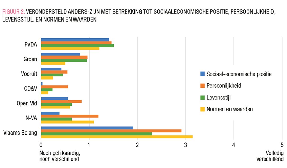 Bovendien tonen deze bevindingen dat kiezers van de uiterst linkse en uiterst rechtse partijen (PVDA op links en Vlaams Belang op rechts) als meest verschillend beschouwd worden op niet-politiek vlak. Vooral de kiezers van Vlaams Belang, de meest rechtse (en enige radicaal-rechtse) partij in het Vlaams parlement, worden door bijna alle kiezers gezien als zeer verschillend van hen, met uitzondering van de N-VA-kiezers: zij zien de doorsnee Vlaams Belang-kiezer als eerder licht verschillend van zichzelf (gemiddelde score van 6,2/10 op de schaal van anders-zijn).