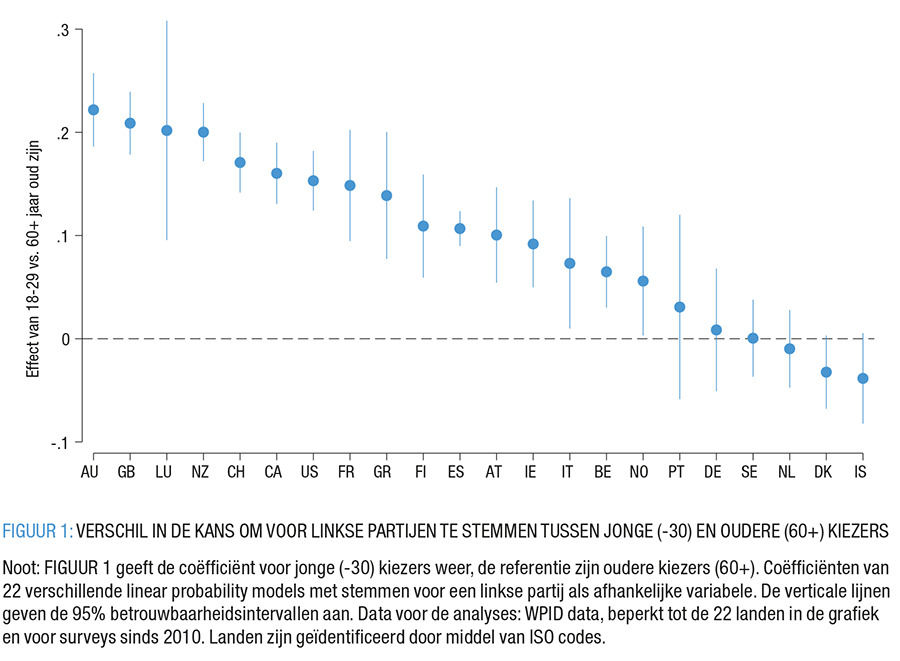 Onze studie, waarvan hier de belangrijkste resultaten zijn samengevat, maakt gebruik van verschillende benaderingen en datasets om leeftijdsverschillen in stemmen voor linkse partijen te onderzoeken. Elk van die testen leidt tot dezelfde conclusie: of jongeren meer of minder op linkse partijen stemmen dan oudere kiezers hangt af van de positie die linkse en niet-linkse partijen innemen op de sociaal-culturele dimensie. Jongere kiezers geven de voorkeur aan sociaal-progressieve partijen. Bijgevolg zien we dat de leeftijdsverschillen in steun voor linkse partijen groter zijn in contexten waar linkse partijen veel progressiever zijn dan rechtse partijen.