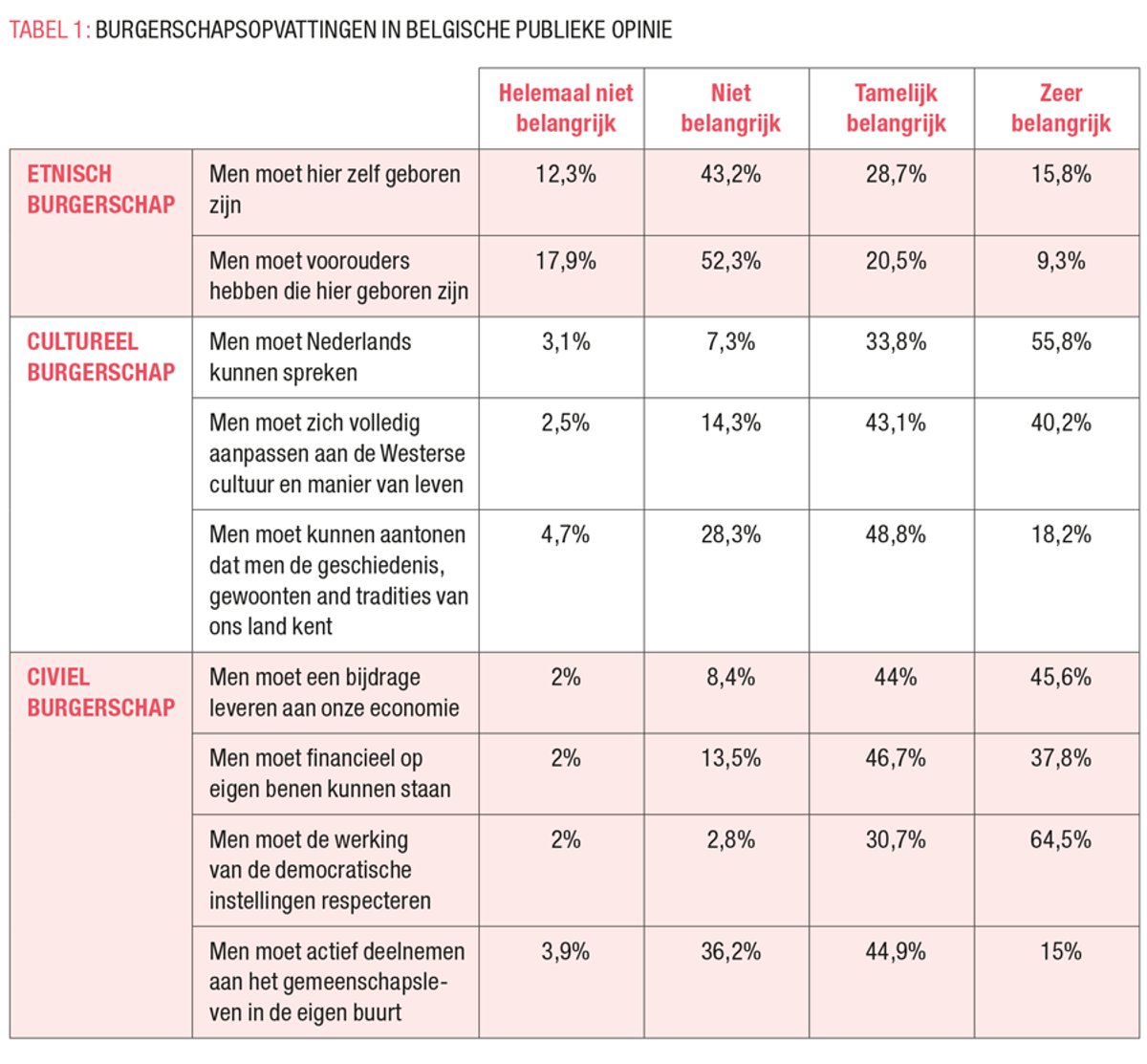 Opvallend is dat etnische criteria voor burgerschap nog steeds behoorlijk veel steun krijgen onder Belgen – ook al betekent dit in de praktijk dat veel migranten, ongeacht hun inspanningen, uitgesloten zullen blijven. Zo vindt 44% van de Belgen het tamelijk tot zeer belangrijk dat men in België geboren moet zijn en 30% dat men ouders moet hebben die in België geboren zijn.