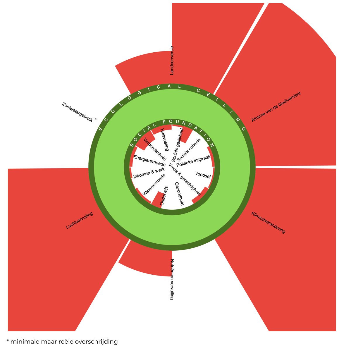 De donut is nu voor het eerst ook naar Vlaanderen vertaald. Het resultaat toont in één oogopslag welke behoeften Vlaanderen wel of niet vervult (FIGUUR HIERONDER). Ecologisch kleurt de donut bloedrood. Vlaanderen overschrijdt alle naar onze regio vertaalde planetaire grenzen. Op sociaal gebied scoort Vlaanderen gemengd, met mooie resultaten qua medische zorg en voedsel, maar structurele buizen voor discriminatie, energiearmoede en betaalbaar wonen.